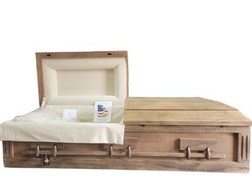 Oval Fluted corner design with Rustic style lugs, Flat top lid and custom standard base. This casket comes with duck cloth interiors, a natural satin finish and antique bronze hardware.